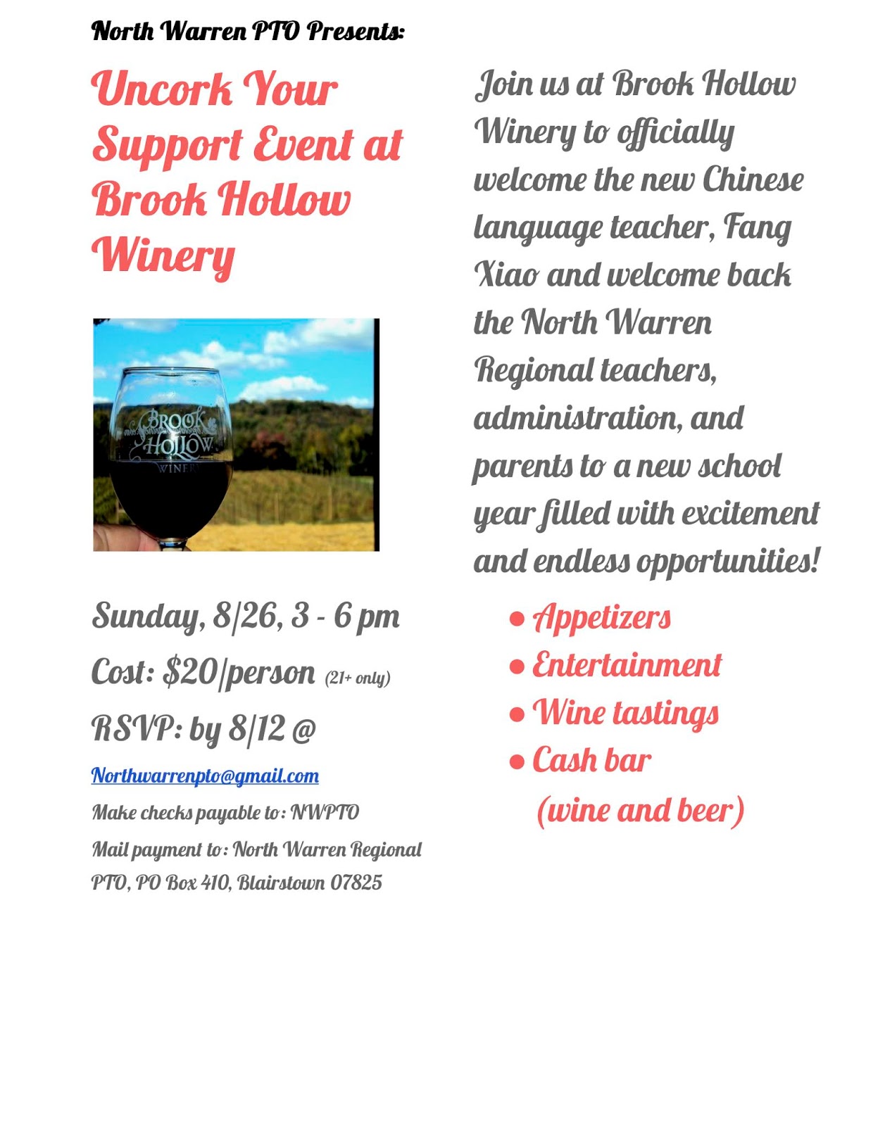 Join us at Brook Hollow Winery to officially welcome the new Chinese language teacher, Fang Xiao and welcome back the North Warren Regional teachers, administration, and parents to a new school year filled with excitement and endless opportunities!