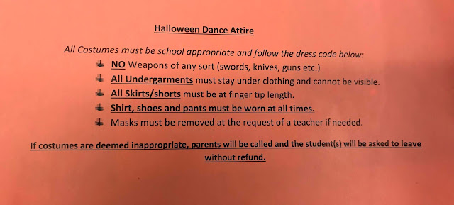 The next middle school dance is Friday, October 19 from 6-9. Students may wear costumes as long as they follow the dress code. The dress code is attached.