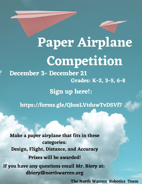 North Warren STEM/ Robotics Team are hosting a couple of community competitions over the next few months. We wish to engage the community in STEM and STEM related projects to help as we all go through this hard time. The first of these is a paper airplane competition for three grade bands. All North Warren areas students are welcome to participate. Once your plane is done, and you have recorded a video of it doing all 4 of the design characteristics, please use the link below to submit your airplane. Judges for this are the lead engineering students of NWR Robotics Team 6945. Prizes will be awarded. Please have designs be original.
