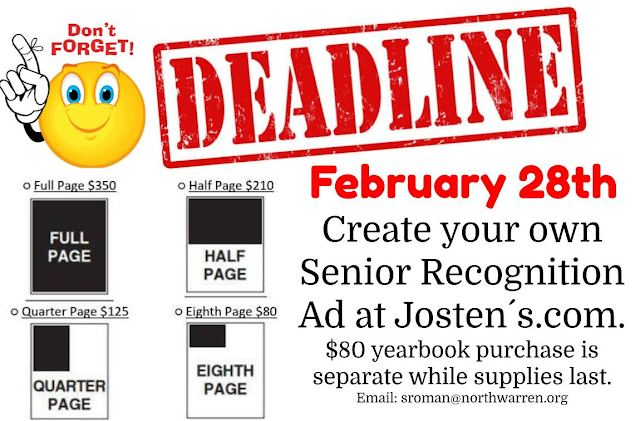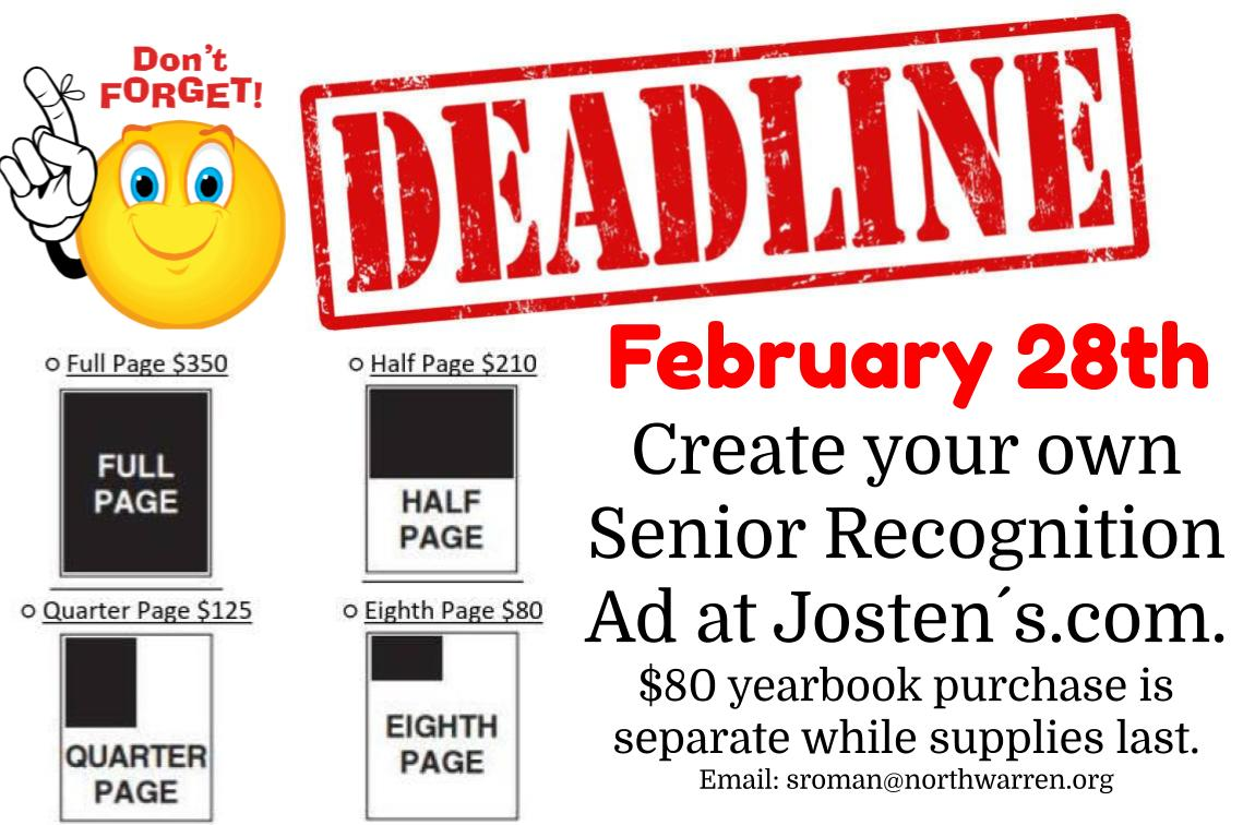 Yearbook / News & Announcements / By North Warren News / February 24, 2020 Don’t forget that the deadline for Senior Recognition Ads is this Friday, February 28th. Create your own Senior Recognition Ad on Jostens.com. $80 yearbook purchase is separate while supplies last.